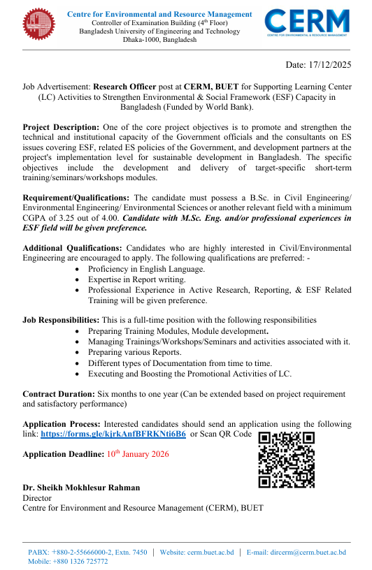 Research Officer post at CERM, BUET for Supporting Learning Center (LC) Activities to Strengthen Environmental & Social Framework (ESF) Capacity in Bangladesh (Funded by World Bank).